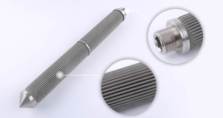 采用不銹鋼纖維燒結氈作為核心過濾層,該燒結氈過濾層主要材料為直徑1~80μm的細長纖維,將這些金屬纖維均勻鋪放,形成三維結構的費編織網,在經過高溫燒結,纖維便在接點處固定,從而形成了整體優良的過濾材料。