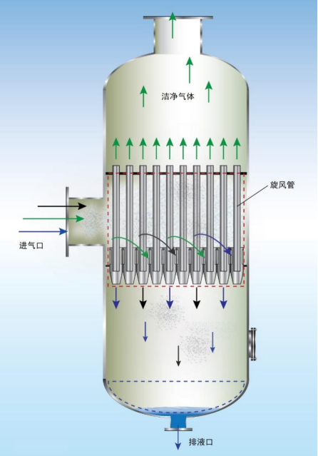 由旋風子上部的切向進口進入旋風子,使其沿器壁高速旋轉轉向器底旋轉,到達底部后折向成為內層的上旋氣流,從旋風分離器的排氣口排出