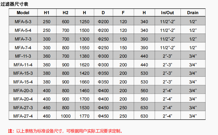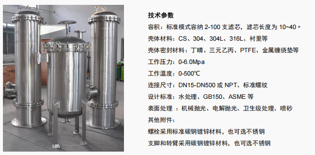 產品描述 JN-MFA 密過濾器筒體外殼一般采用不銹鋼材質制造,內部根據工藝要求配備不同管狀濾芯作為過濾元件,根據不 同的過濾介質及設計工藝選擇不同的過濾元件,以達到流體潔凈的要求。機體也可選用快裝式,以方便快捷的更換濾 芯及清洗。MFA 精密過濾器過濾精度高、結構簡單、更換濾芯方便、應用范圍廣、占地面積小、處理能力強。 工作原理:過濾液體由過濾器進口流入,經濾芯自外向里透過濾層而被過濾成為清澄液體,然后經出口排出。雜質被 截留在濾芯的深層及表面,從而液體被達到過濾的目的。