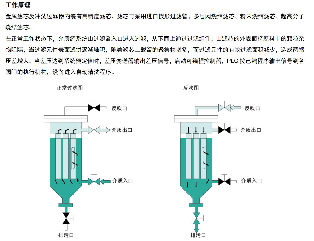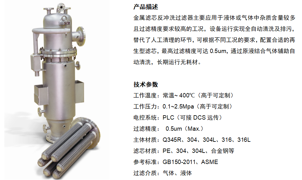 金屬濾芯反沖洗過濾器主要應用于液體或氣體中雜質含量較多且過濾精度要求較高的工況,設備運行實現全自動清洗及排污,替代了人工清理的環節,可根據不同工況的要求,配置合適的再生型濾芯,最高過濾精度可達0.5um,通過原液結合氣體輔助自動清洗,長期運行無耗材。