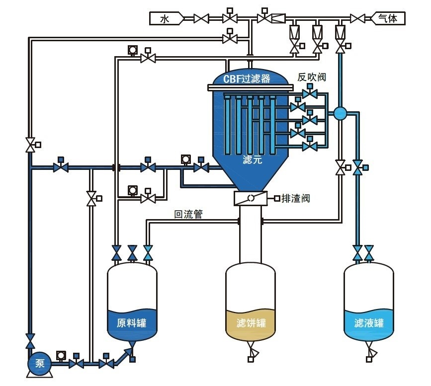 如要得到干燥濾餅,則在過濾后或洗滌過濾后在機內通入常溫空氣、熱空氣或蒸汽等進行壓濾,直至使濾餅達到所需的干度后再使機內泄壓,并反吹濾餅從底部卸料。