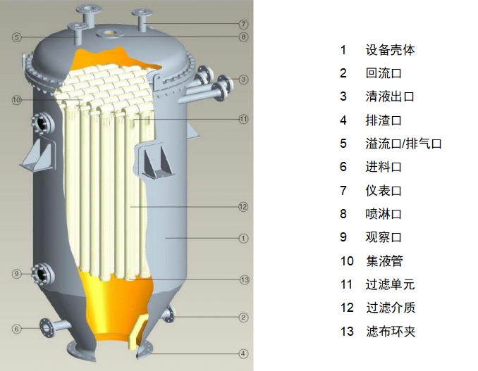 過濾狀態:液體透過濾布,從多孔管中流向中心管,再流向集液管。濾布受壓貼附于支撐管外表面,凹凸的支撐管能夠增大過濾面積并幫助固定濾餅,防止濾餅脫落,從而穩定過濾效果。
