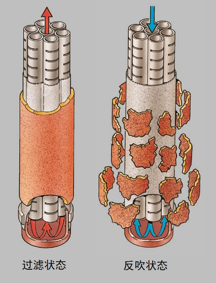 反吹狀態:通入反吹氣體,從無孔中心管流向多孔管,濾布鼓脹變圓,有效振飛剝離濾餅,同時可以除去濾布纖維中的微粒,提高反吹效率,快速恢復濾布過濾能力。