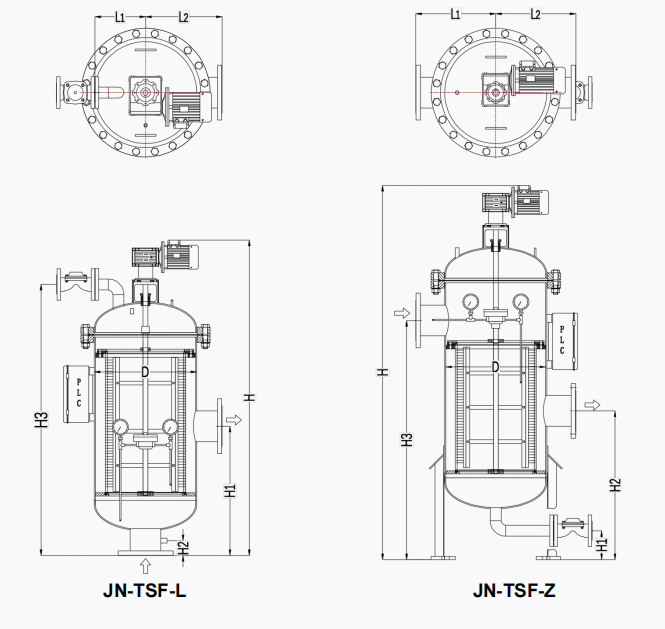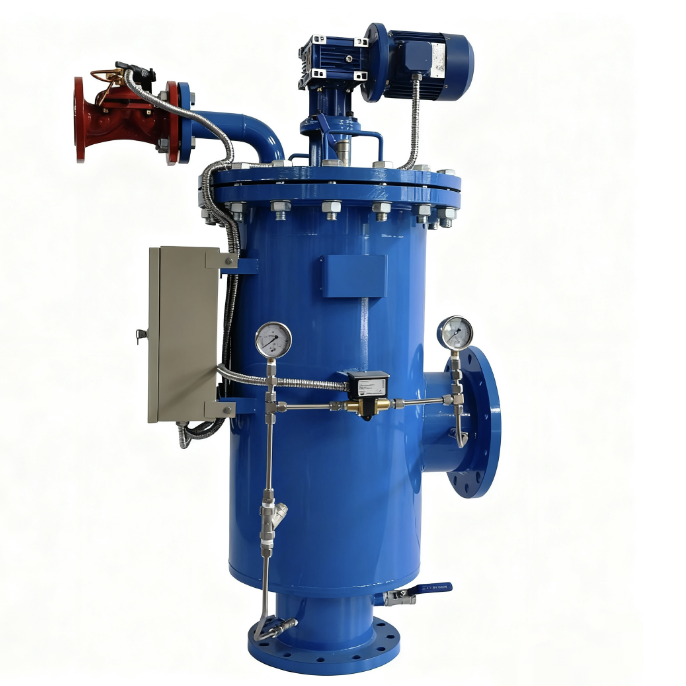 當水從進水口進入過濾器濾筒內部,雜質被攔截在過濾筒內壁, 過濾后的干凈水從出水口流出,當濾筒內壁的雜質越積越多時, 精密過濾器進出口的壓差達到預設值、達到清洗時間或手動預 制時,過濾器將開始自清洗過程,整個自清洗過程包含兩個步 驟:打開位于過濾器上的自動排污閥;電機帶動精密過濾器濾 網內的清洗刷,被濾網所攔截下來的雜質從排污閥排出,清洗 時系統不斷流,精密過濾器的整個運行過程由隨機配備的一個 智能控制箱來控制。控制方式可選壓差、時間、手動及 PLC 制。